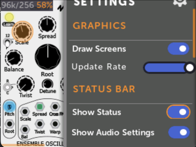 The other feature added is displaying audio rate/block size and CPU load in the module view. This can be enabled/disabled in the Module View display settings menu.