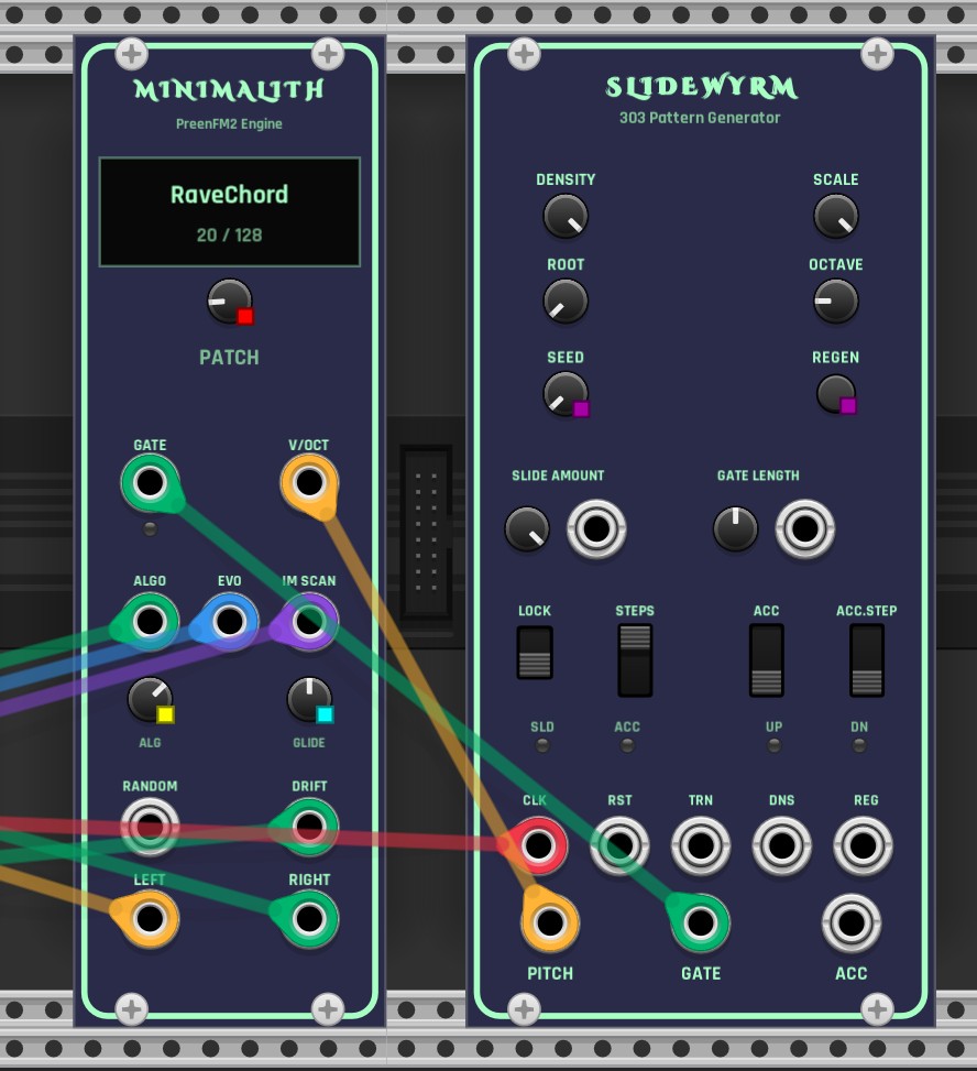 Slidewyrm - ported version of the really wonderful TB3PO (from ornament & crime) with some additions: accent out, auto accent on either step 4 or 8 or random. Slide amount, Gate length - both CV:able.