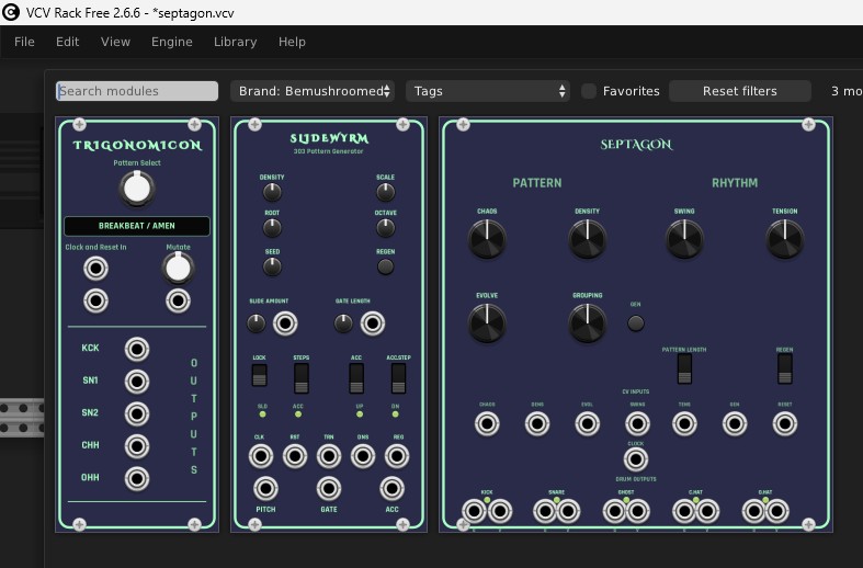 Septagon - a 7/4 drum generator (no built in patterns, entirely generative). Struggling slightly with performance here, the other two has great performance, not this one. 18-20% at 48KHz, so not good at all i think, will give it another pass. Has some cool features like generated velocity and outs for this. I do like the Trigonomicon better, so far.