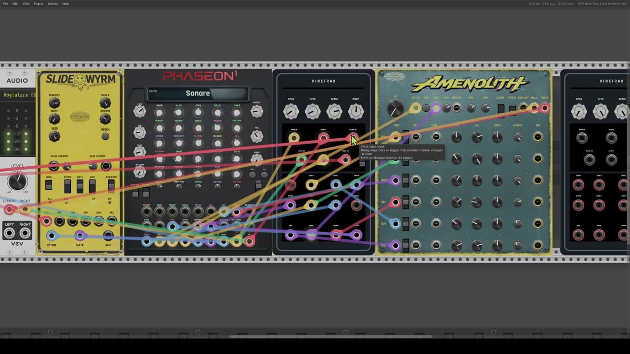 So in this demo its just Phaseon1 into Kinetrax, Kinetrax gate outs into Amenolith. Some gates and the CV out from Kinetrax goes to some of the various ins on Phaseon1.